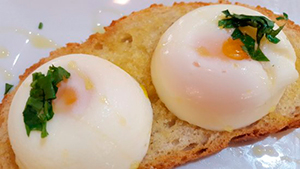 1. Unte com azeite um potinho de cerâmica pequeno e despeje 1 ovo sem casca. Coloque o potinho em uma frigideira tampada com água fervente de modo que a água não ultrapasse a metade do potinho. Deixe que o ovo cozinhe por 3 minutos até que a clara fique bem cozida e a gema mole. Desenforme com a ajuda da ponta de uma faca, tempere com sal e pimenta-do-reino moída e sirva com o petisco de pão.